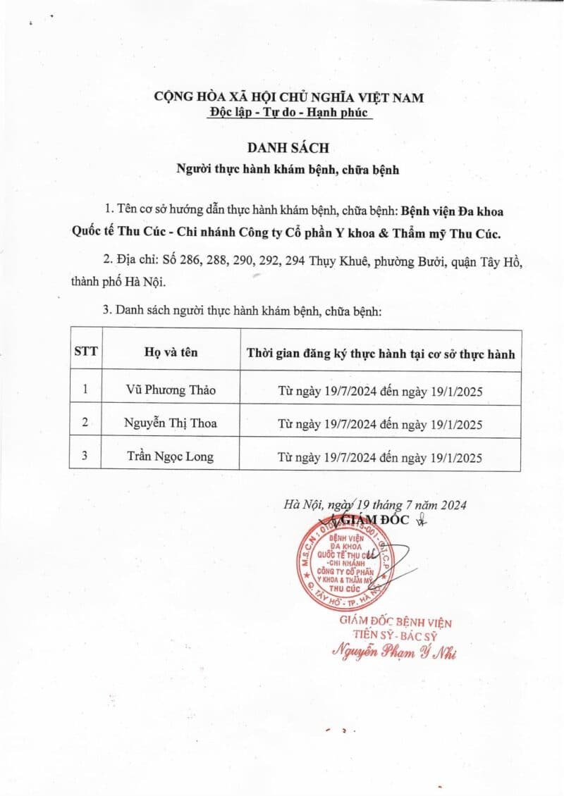 Danh sách người thực hành khám bệnh, chữa bệnh tại Bệnh viện Đa khoa quốc tế Thu Cúc từ ngày 19/7/2024