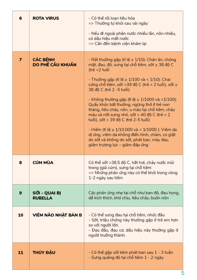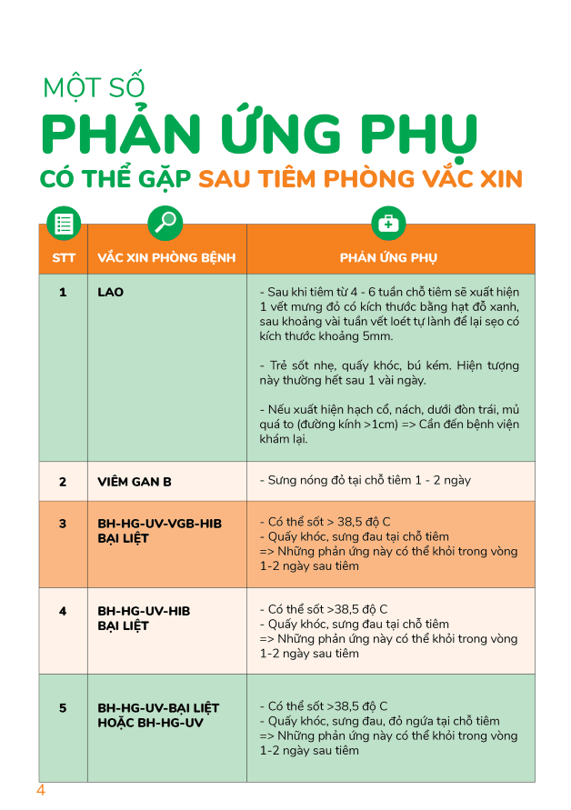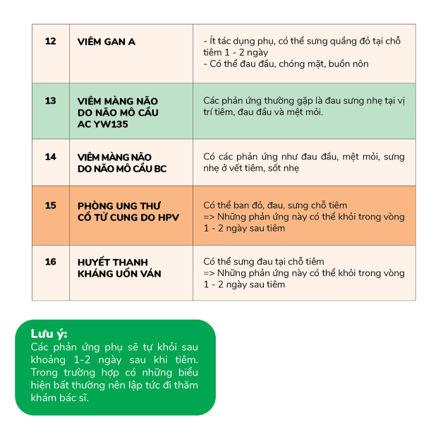 Chúng ta cần lưu ý một số phản ứng phụ có thể xảy ra sau khi tiêm chủng vắc xin bên dưới đây, để có phương án theo dõi sức khỏe sau tiêm, nhất là với đối tượng trẻ em.