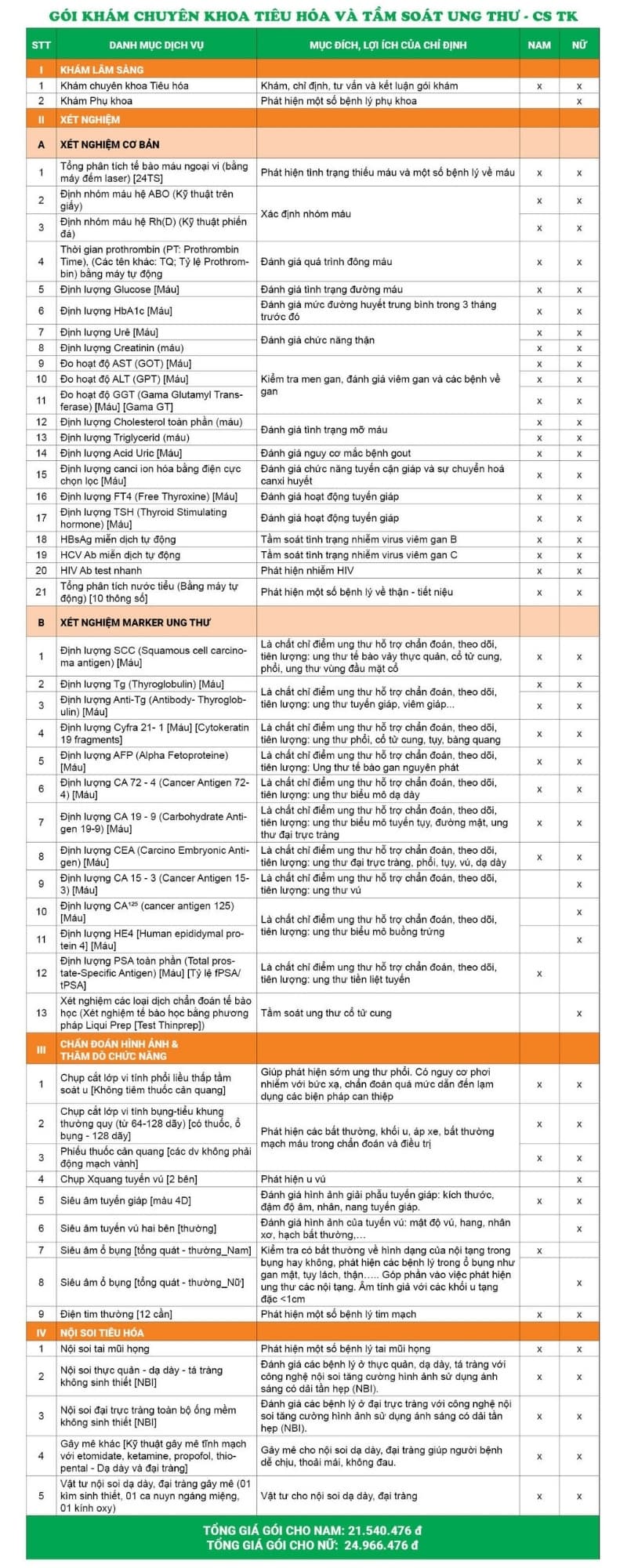 Chi tiết đầy đủ các danh mục khám và chi phí gói khám, khách hàng tham khảo trong ảnh sau:
