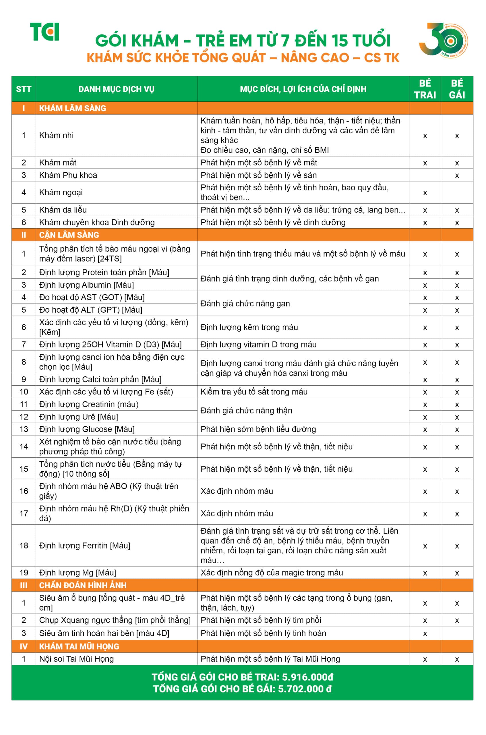 Gói khám sức khỏe tổng quát nâng cao ra đời với mục tiêu hỗ trợ ba mẹ xác định đúng vấn đề sức khỏe của trẻ ở giai đoạn từ 7 đến 15 tuổi, từ đó định hướng đúng đắn để trẻ phát triển toàn diện, theo hướng tích cực nhất. Gói khám bao gồm nhiều danh mục thiết yếu, từ cơ bản đến nâng cao như: Khám cận lâm sàng, Xét nghiệm máu, Chụp X-quang ngực thẳng, Siêu âm ổ bụng tổng quát [màu 4D], Siêu âm tử cung phần phụ [đường bụng thường], Siêu âm tinh hoàn 2 bên [màu 4D].