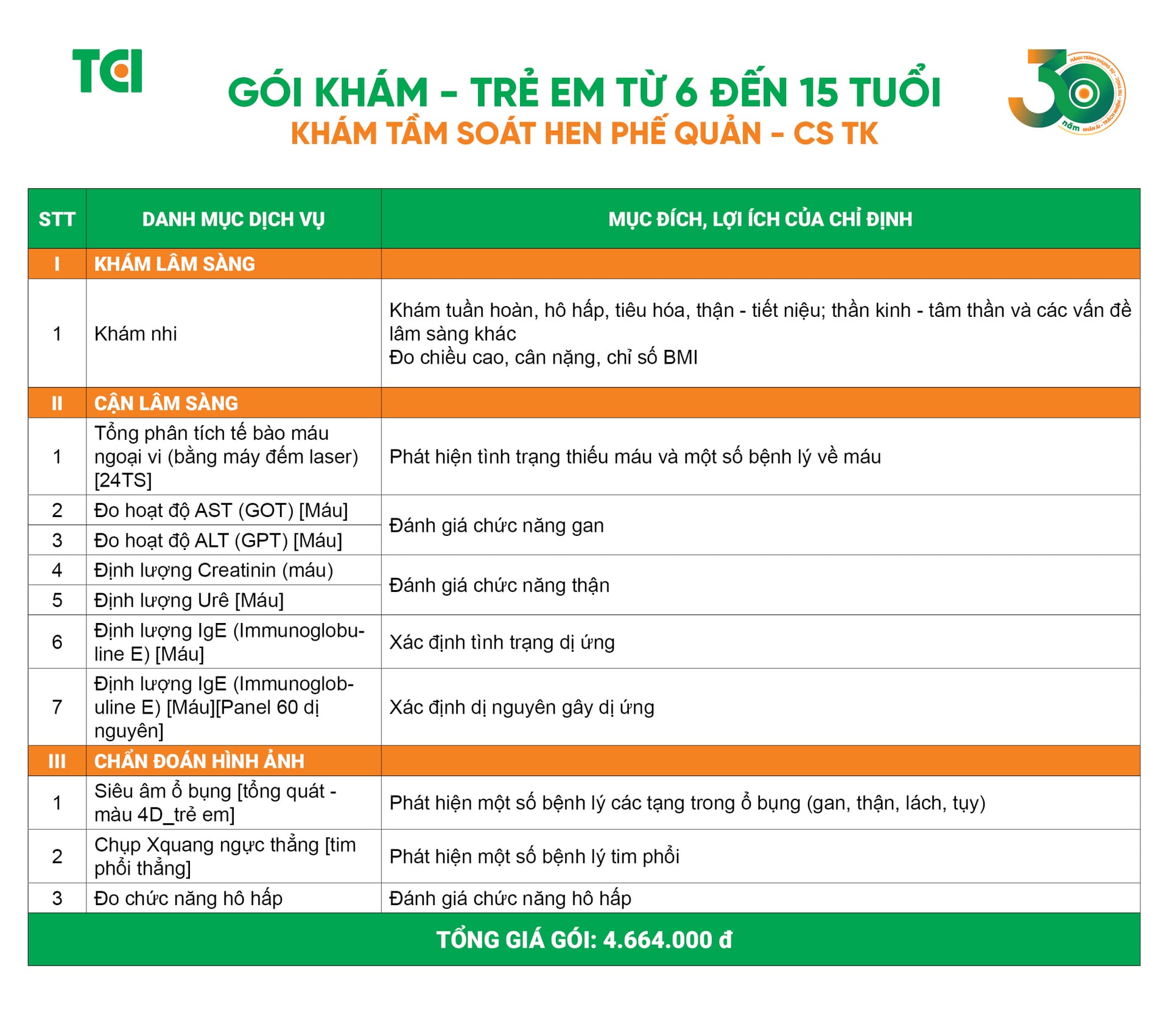 Danh mục chi tiết của Gói khám tầm soát hen phế quản cho trẻ từ 6 đến 15 tuổi, Quý khách hàng có thể tham khảo dưới đây:
