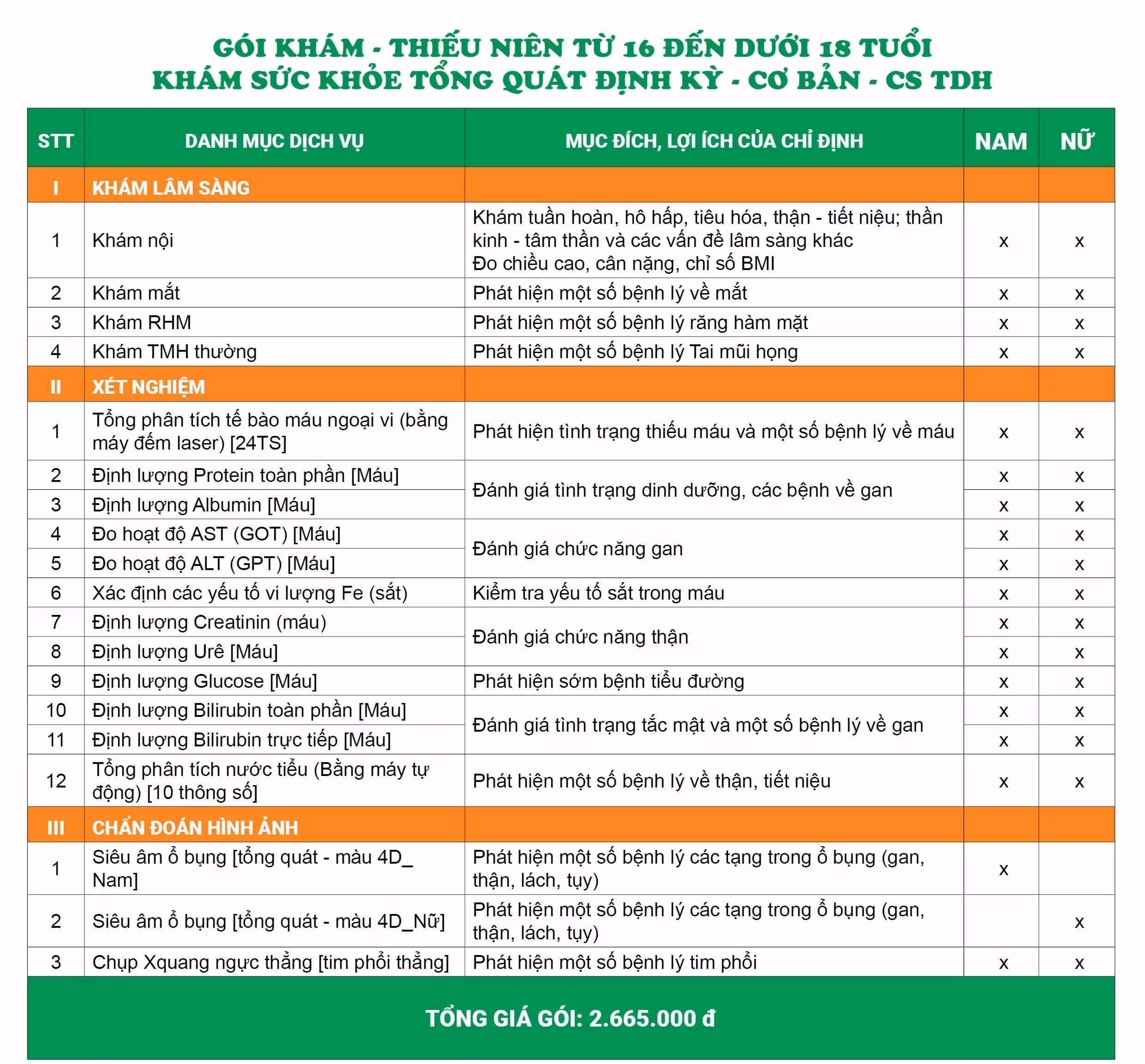 2. Danh mục gói khám sức khỏe tổng quát định kỳ cho thiếu niên từ 16 đến dưới 18 tuổi – Cơ bản