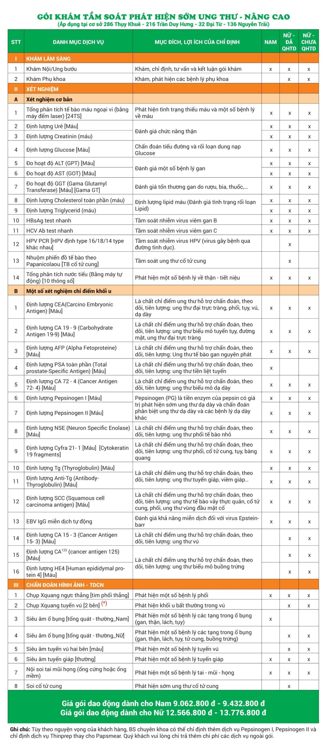 2. Danh mục Gói khám tầm soát phát hiện sớm ung thư – Nâng cao