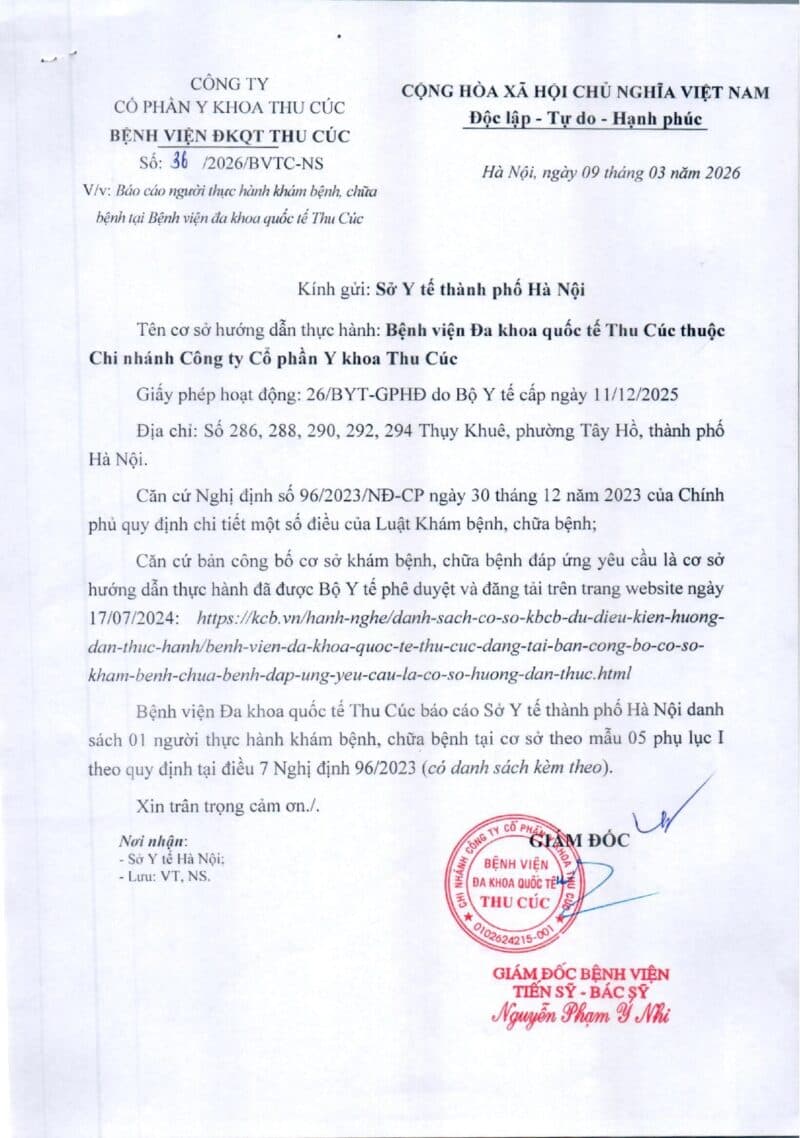 Căn cứ nghị định 96/2023/NĐ-CP ngày 30/12/2023 của Chính phủ, Căn cứ bản công bố cơ sở khám bệnh, chữa bệnh đáp ứng yêu cầu là cơ sở hướng dẫn thực hành được Bộ Y tế đăng tải ngày 17/7/2024, Bệnh viện Đa khoa quốc tế Thu Cúc đăng tải danh sách 01 người đăng ký thực hành tại cơ sở từ ngày 09/03/2026 theo mẫu 05 phụ lục I Nghị đinh 96.