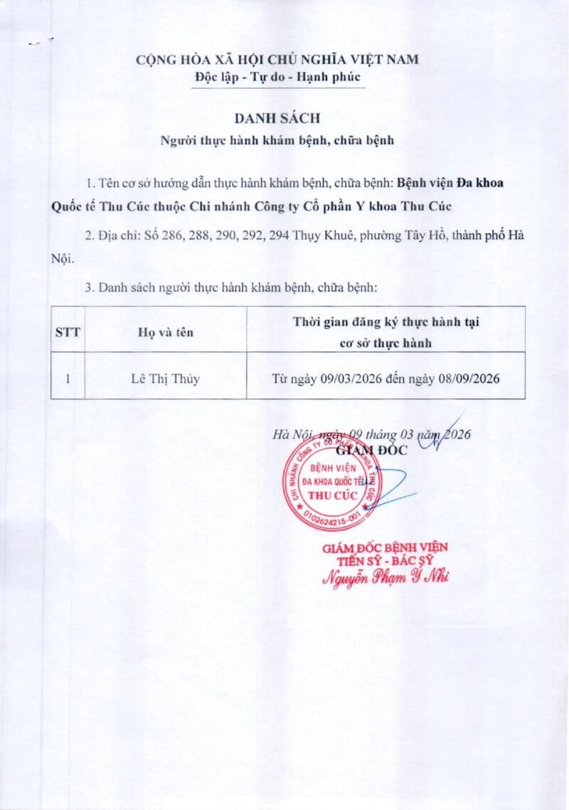 Bệnh viện Đa khoa quốc tế Thu Cúc đăng tải danh sách người đăng ký thực hành tại cơ sở từ ngày 09/03/2026
