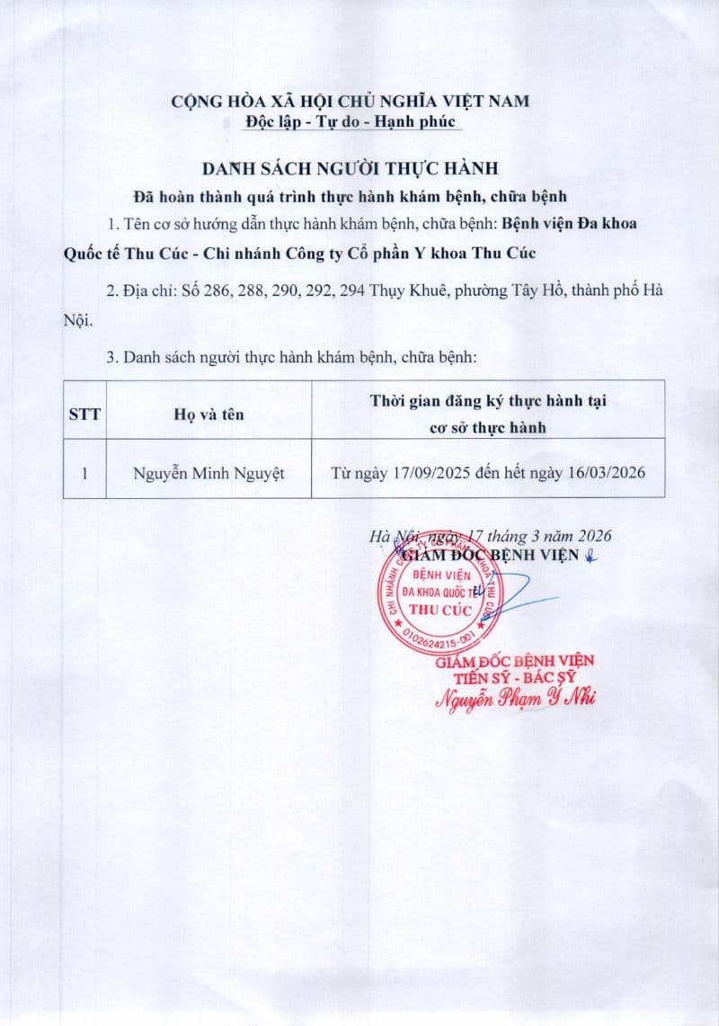 Bệnh viện Đa khoa quốc tế Thu Cúc đăng tải danh sách người thực hành đã hoàn thành quá trình thực hành khám bệnh, chữa bệnh