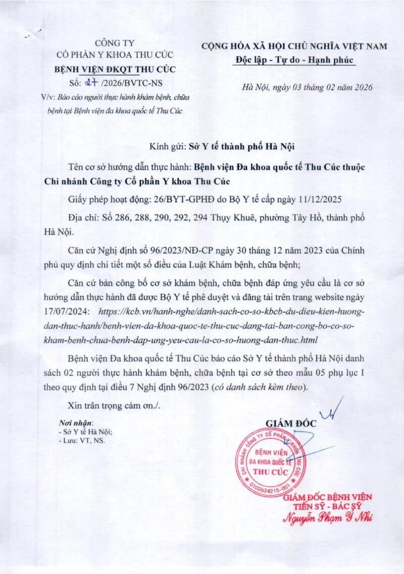 Căn cứ nghị định 96/2023/NĐ-CP ngày 30/12/2023 của Chính phủ, Căn cứ bản công bố cơ sở khám bệnh, chữa bệnh đáp ứng yêu cầu là cơ sở hướng dẫn thực hành được Bộ Y tế đăng tải ngày 17/7/2024, Bệnh viện Đa khoa quốc tế Thu Cúc đăng tải danh sách 02 người đăng ký thực hành tại cơ sở từ ngày 03/02/2026 theo mẫu 05 phụ lục I Nghị đinh 96.
