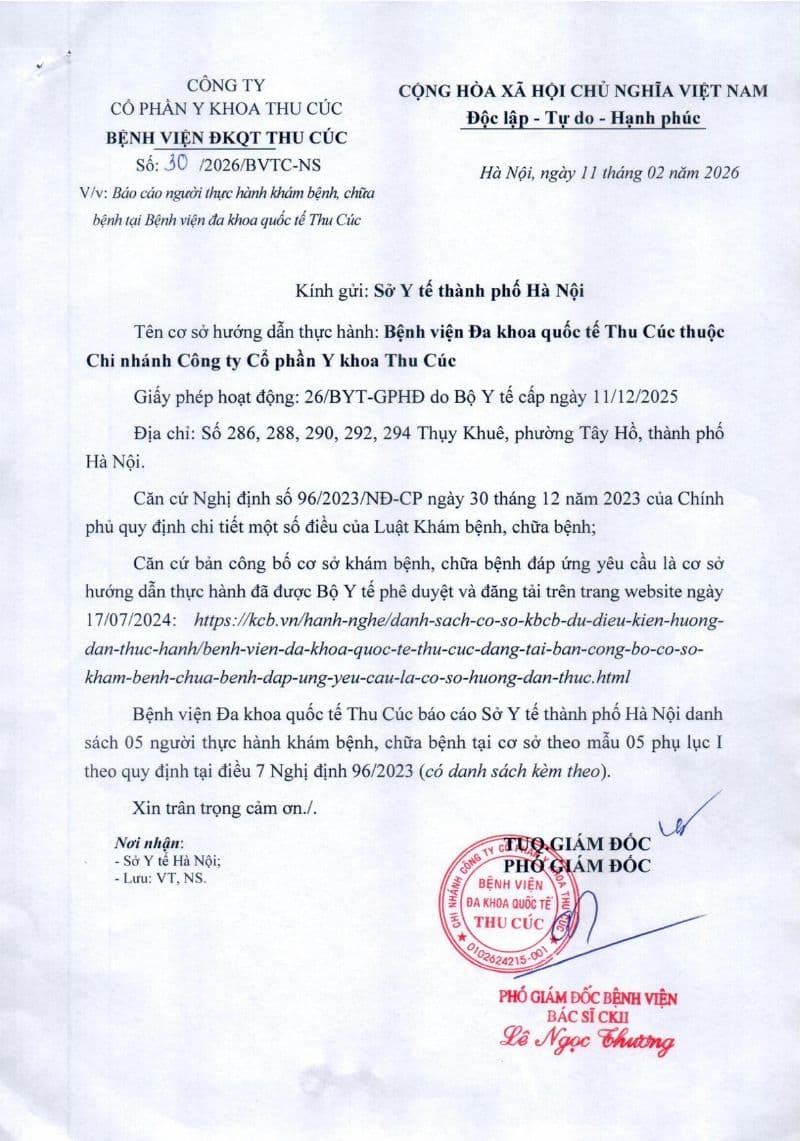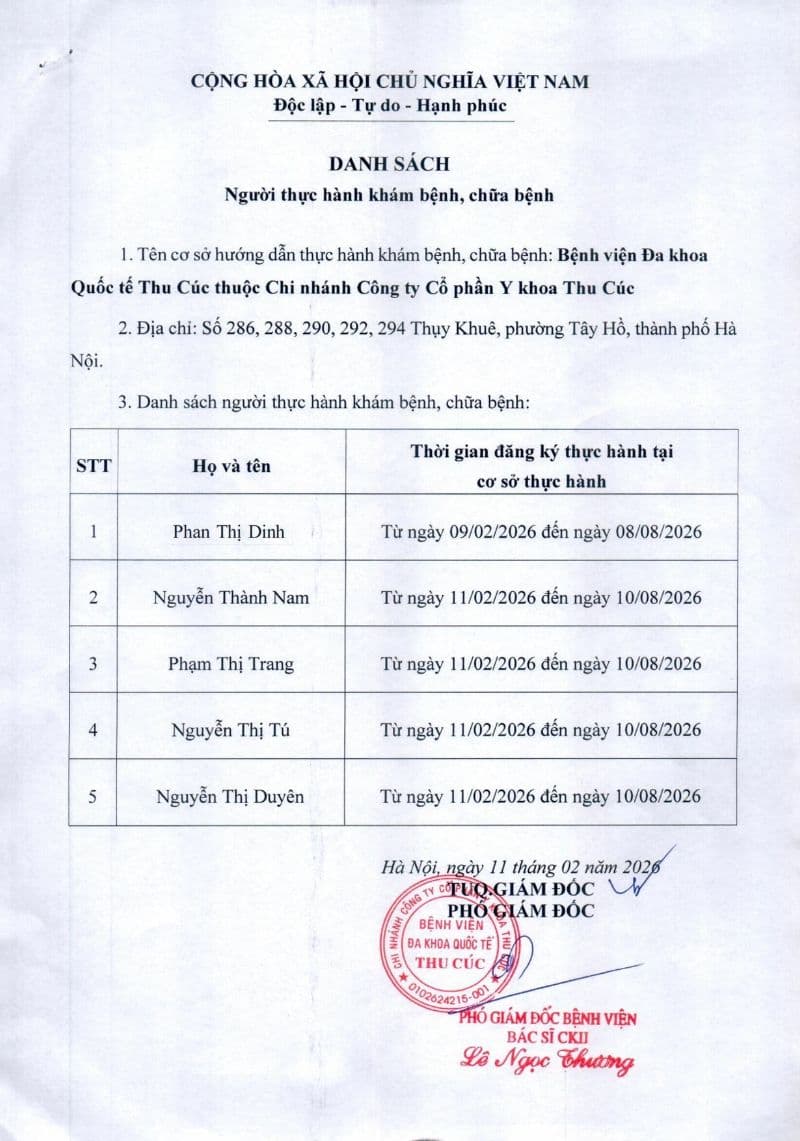 Danh sách 05 người đăng ký thực hành tại Bệnh viện Đa khoa Quốc tế Thu Cúc từ ngày 09/02/2026, 11/2/2026
