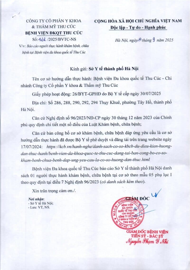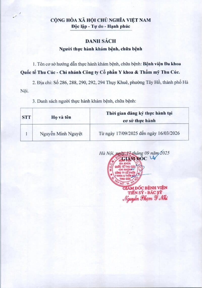 Danh sách đăng ký thực hành khám chữa bệnh tại BVĐKQT Thu Cúc từ ngày 17/9/2025