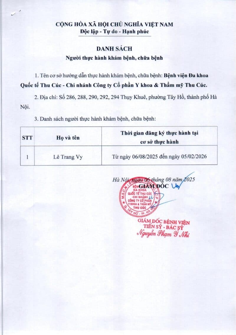 Căn cứ nghị định 96/2023/NĐ-CP ngày 30/12/2023 của Chính phủ, Căn cứ bản công bố cơ sở khám bệnh, chữa bệnh đáp ứng yêu cầu là cơ sở hướng dẫn thực hành được Bộ Y tế đăng tải ngày 17/7/2024, Bệnh viện Đa khoa quốc tế Thu Cúc đăng tải danh sách 01 người đăng ký thực hành tại cơ sở từ ngày 06/08/2025 theo mẫu 05 phụ lục I Nghị đinh 96.