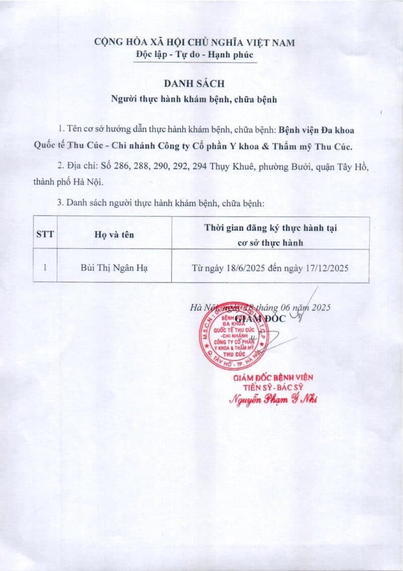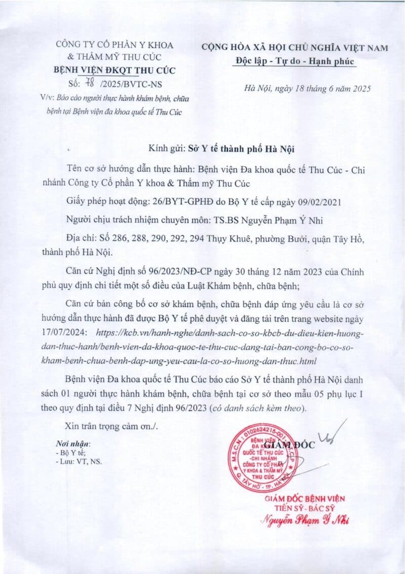 Căn cứ nghị định 96/2023/NĐ-CP ngày 30/12/2023 của Chính phủ, Căn cứ bản công bố cơ sở khám bệnh, chữa bệnh đáp ứng yêu cầu là cơ sở hướng dẫn thực hành được Bộ Y tế đăng tải ngày 17/7/2024, Bệnh viện Đa khoa quốc tế Thu Cúc đăng tải danh sách 01 người đăng ký thực hành tại cơ sở từ ngày 18/6/2025 theo mẫu 05 phụ lục I Nghị đinh 96.