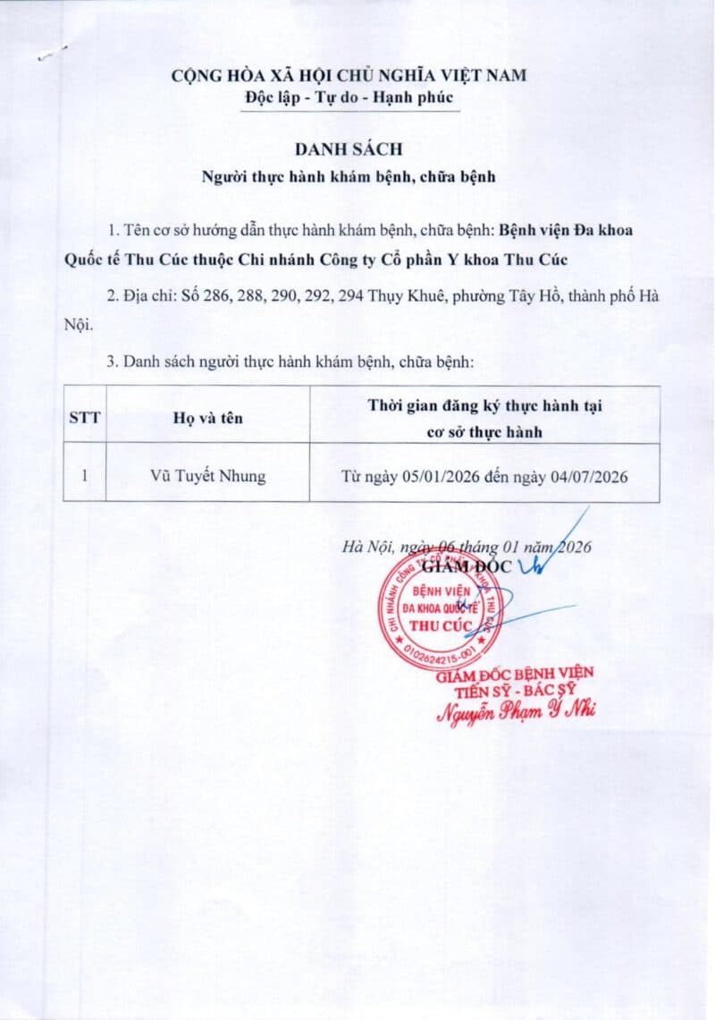 Danh sách người đăng ký thực hành tại Bệnh viện Đa khoa Quốc tế Thu Cúc từ ngày 5/1/2026