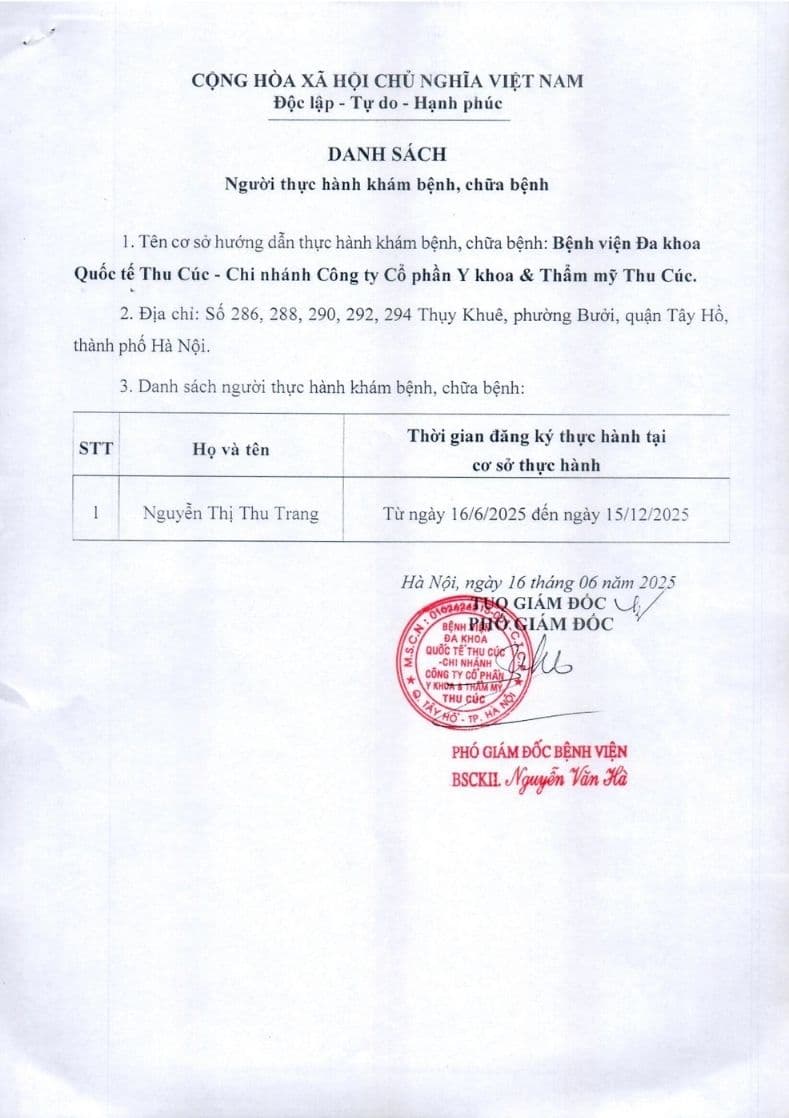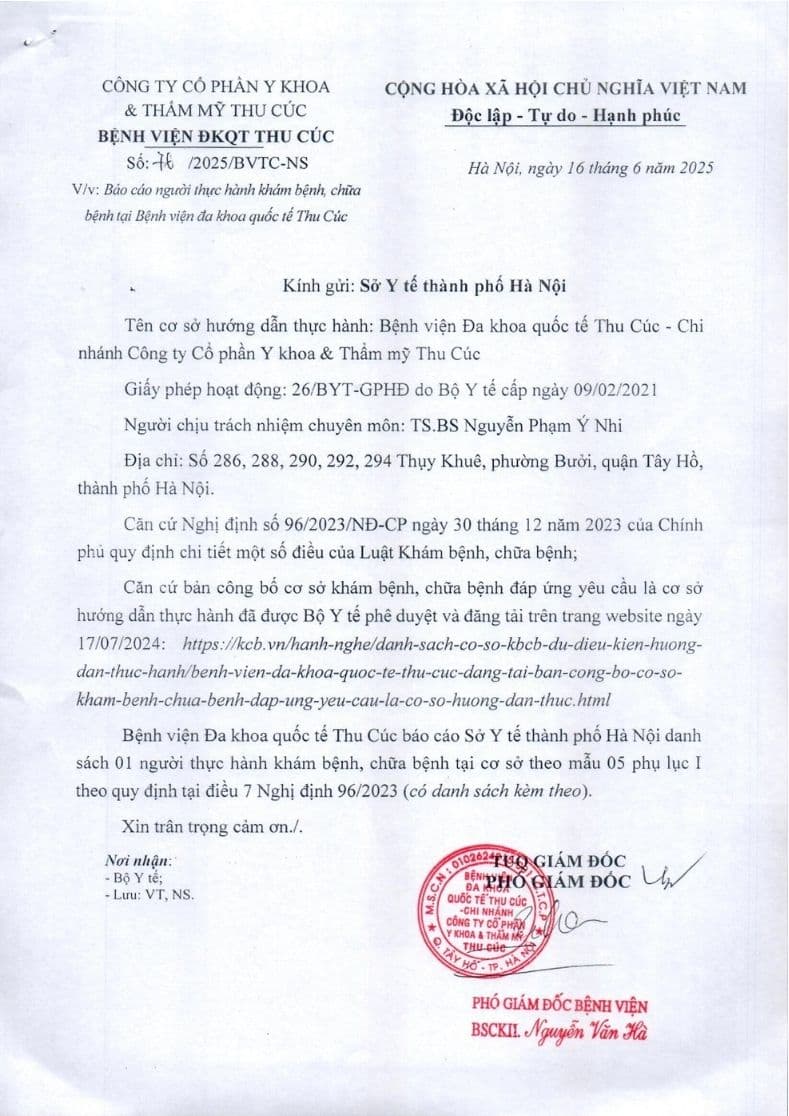 Căn cứ nghị định 96/2023/NĐ-CP ngày 30/12/2023 của Chính phủ, Căn cứ bản công bố cơ sở khám bệnh, chữa bệnh đáp ứng yêu cầu là cơ sở hướng dẫn thực hành được Bộ Y tế đăng tải ngày 17/7/2024, Bệnh viện Đa khoa quốc tế Thu Cúc đăng tải danh sách 01 người đăng ký thực hành tại cơ sở từ ngày 16/6/2025 theo mẫu 05 phụ lục I Nghị định 96.