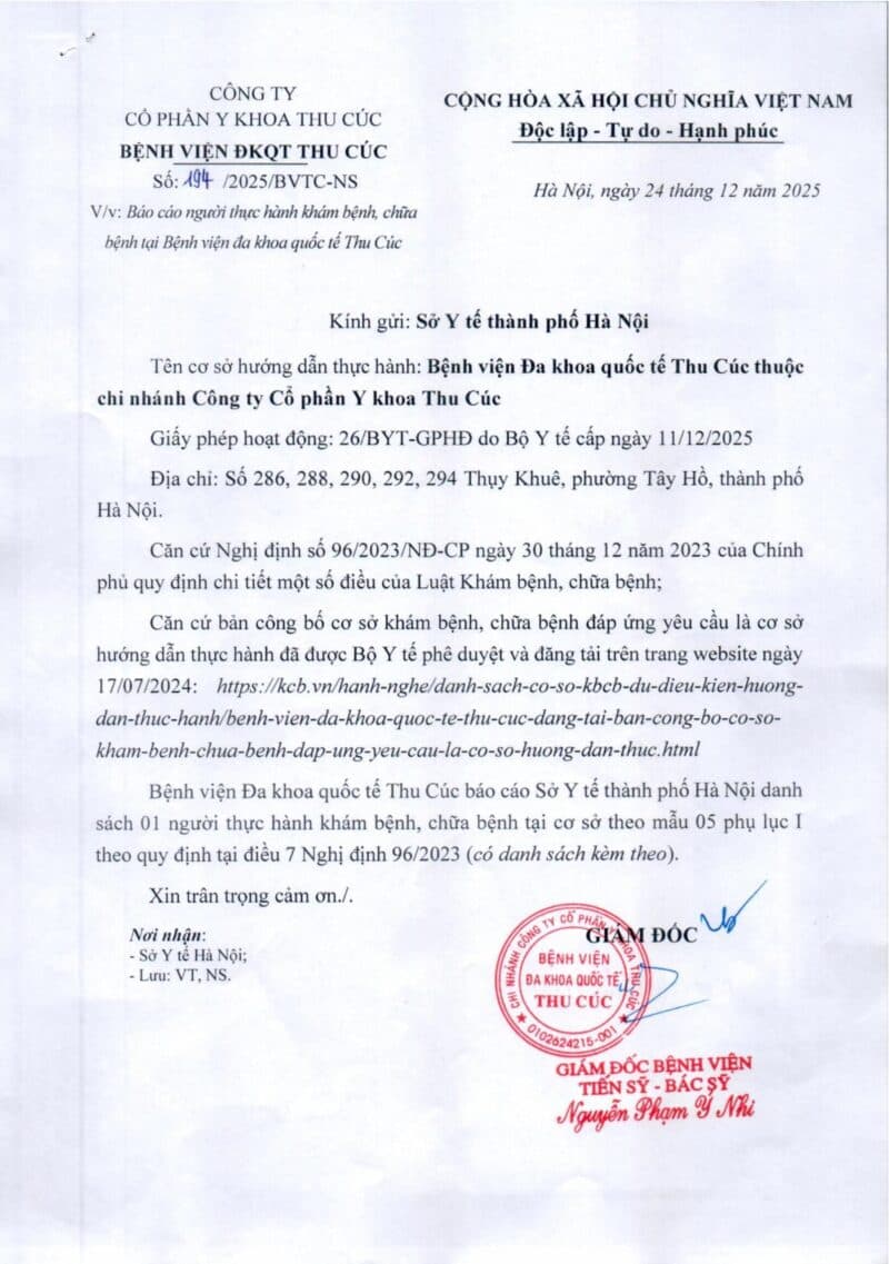 Căn cứ nghị định 96/2023/NĐ-CP ngày 30/12/2023 của Chính phủ, Căn cứ bản công bố cơ sở khám bệnh, chữa bệnh đáp ứng yêu cầu là cơ sở hướng dẫn thực hành được Bộ Y tế đăng tải ngày 17/7/2024, Bệnh viện Đa khoa quốc tế Thu Cúc đăng tải danh sách 01 người đăng ký thực hành tại cơ sở từ ngày 24/12/2025 theo mẫu 05 phụ lục I Nghị đinh 96.