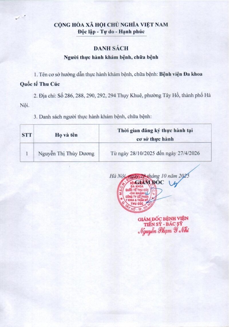 Danh sách đăng ký thực hành tại BVĐKQT Thu Cúc từ 28/10/2025