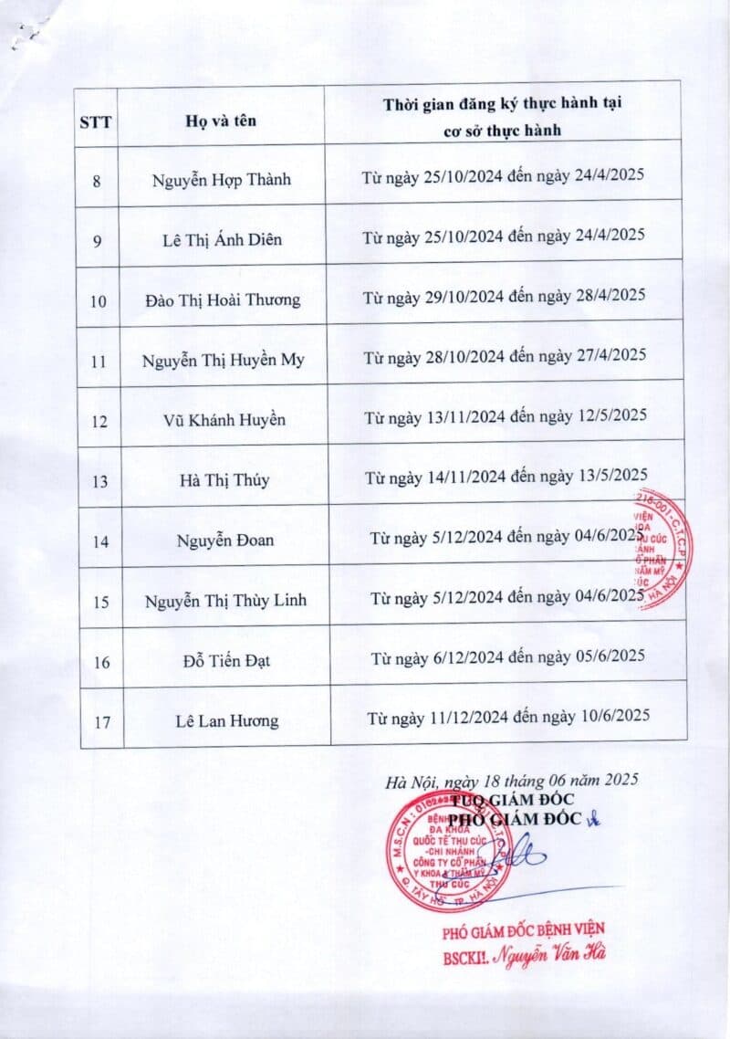 Căn cứ nghị định 96/2023/NĐ-CP ngày 30/12/2023 của Chính phủ, Căn cứ bản công bố cơ sở khám bệnh, chữa bệnh đáp ứng yêu cầu là cơ sở hướng dẫn thực hành được Bộ Y tế đăng tải ngày 17/7/2024, Bệnh viện Đa khoa quốc tế Thu Cúc đăng tải danh sách người thực hành đã hoàn thành quá trình thực hành khám bệnh, chữa bệnh tại TCI.