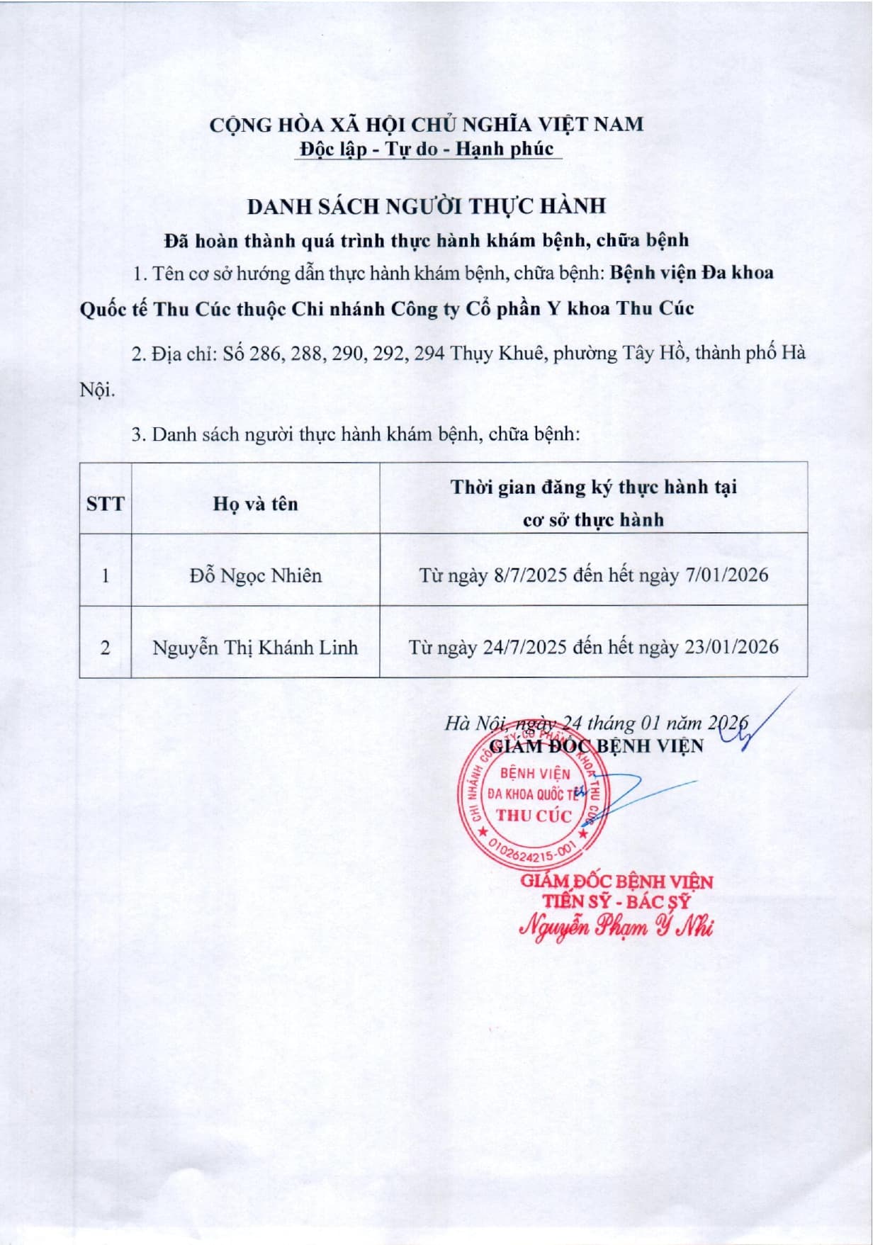 Căn cứ nghị định 96/2023/NĐ-CP ngày 30/12/2023 của Chính phủ, Căn cứ bản công bố cơ sở khám bệnh, chữa bệnh đáp ứng yêu cầu là cơ sở hướng dẫn thực hành được Bộ Y tế đăng tải ngày 17/7/2024, Bệnh viện Đa khoa quốc tế Thu Cúc đăng tải danh sách người thực hành Đã hoàn thành quá trình thực hành khám bệnh, chữa bệnh.