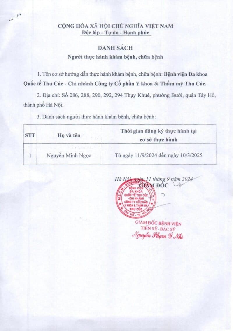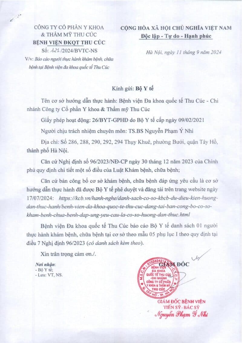 Danh sách người thực hành khám bệnh, chữa bệnh tại Bệnh viện Đa khoa quốc tế Thu Cúc từ ngày 11/9/2024