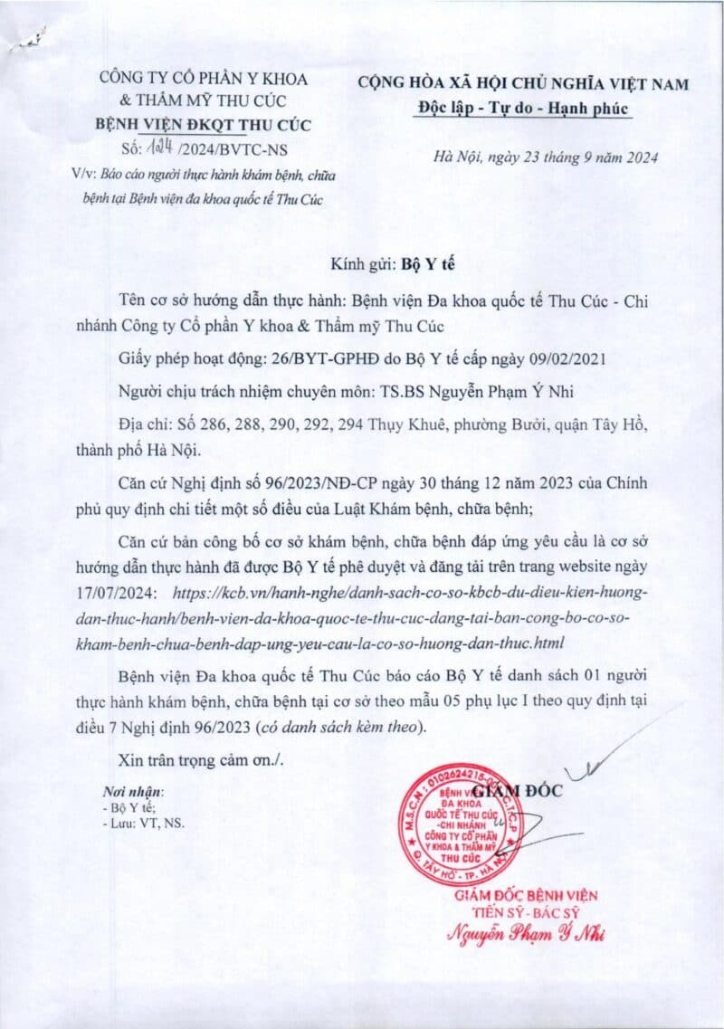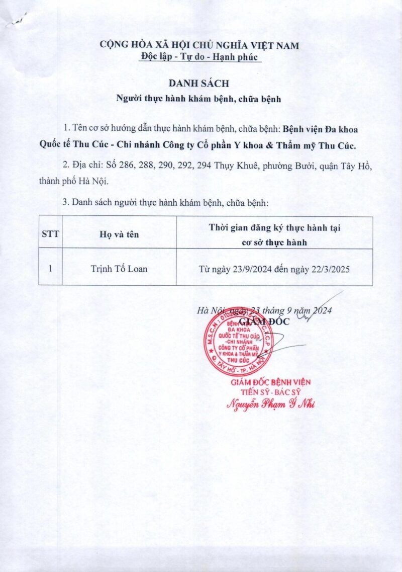 Danh sách người thực hành khám bệnh, chữa bệnh tại Bệnh viện ĐKQT Thu Cúc từ ngày 23/9/2024