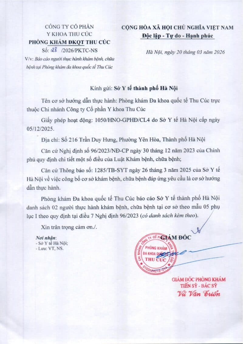 Căn cứ nghị định 96/2023/NĐ-CP ngày 30/12/2023 của Chính phủ, Căn cứ Thông báo số: 1285/TB-SYT ngày 26 tháng 3 năm 2025 của Sở Y tế Hà Nội về việc công bố cơ sở khám bệnh, chữa bệnh đáp ứng yêu cầu là cơ sở hướng dẫn thực hành, Phòng khám Đa khoa quốc tế Thu Cúc đăng tải danh sách 02 người đăng ký thực hành tại cơ sở từ ngày 20/03/2026 theo mẫu 05 phụ lục I Nghị đinh 96.