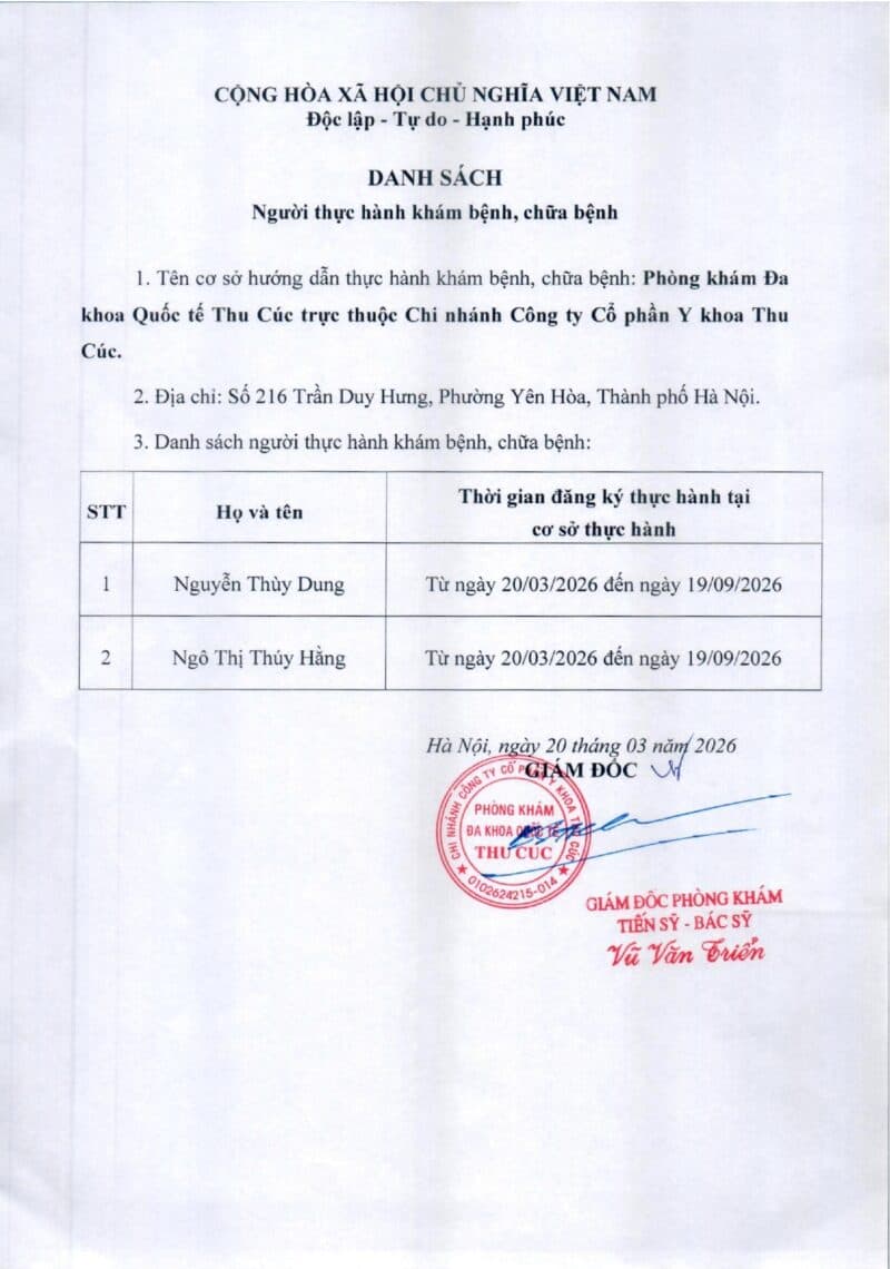 Phòng khám Đa khoa quốc tế Thu Cúc đăng tải danh sách 02 người đăng ký thực hành tại cơ sở từ ngày 20/03/2026