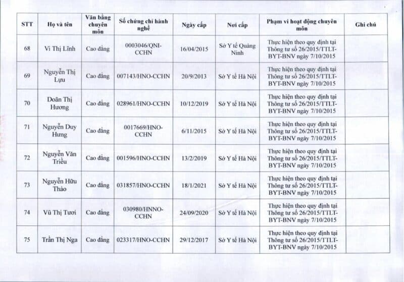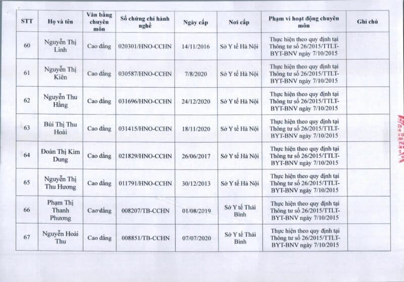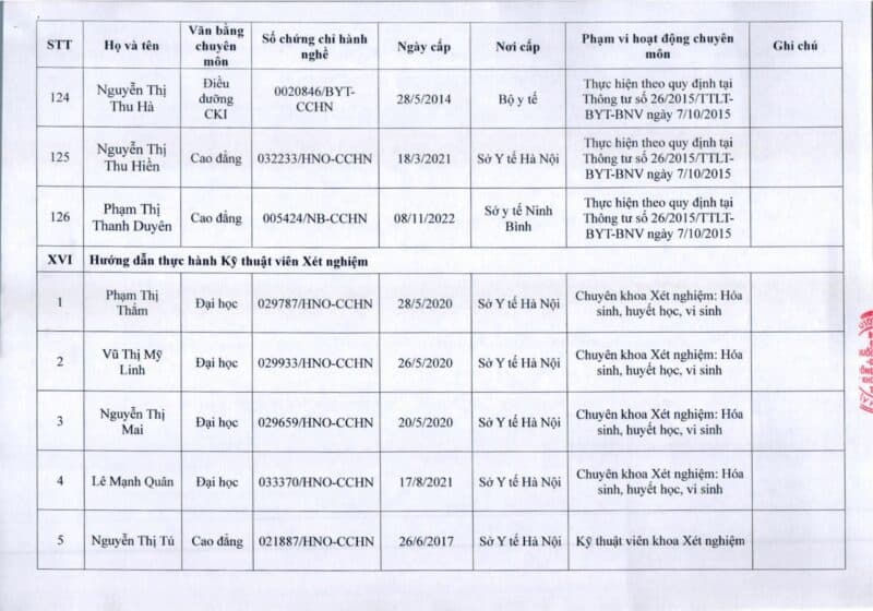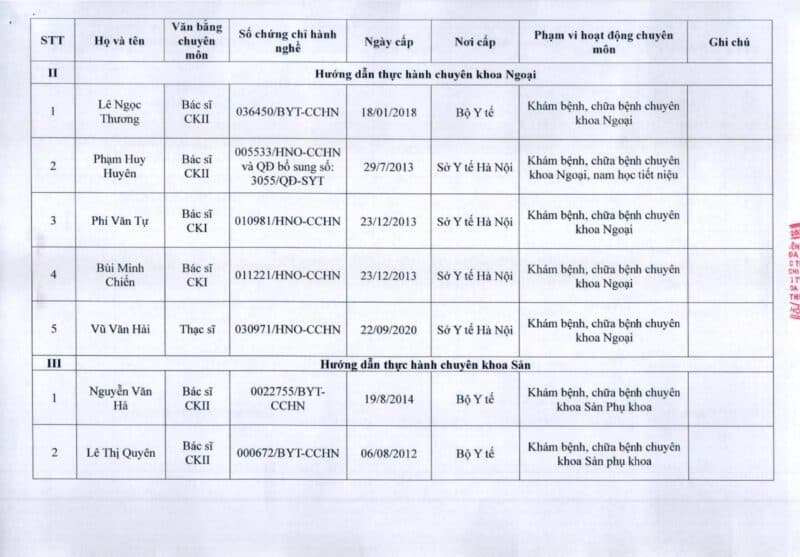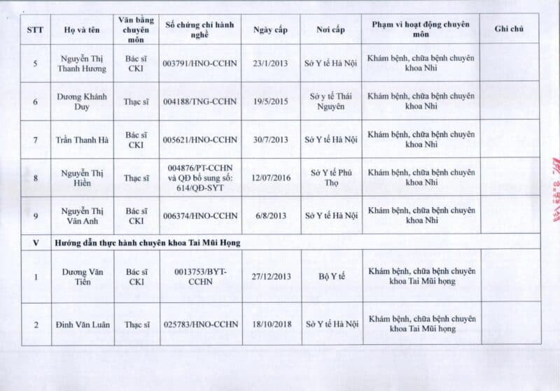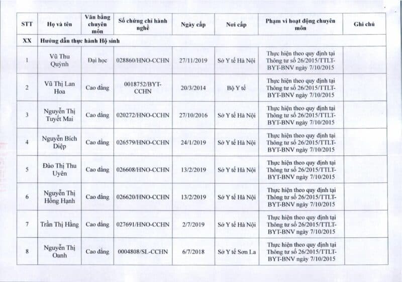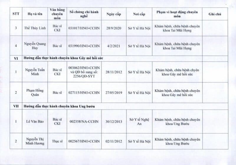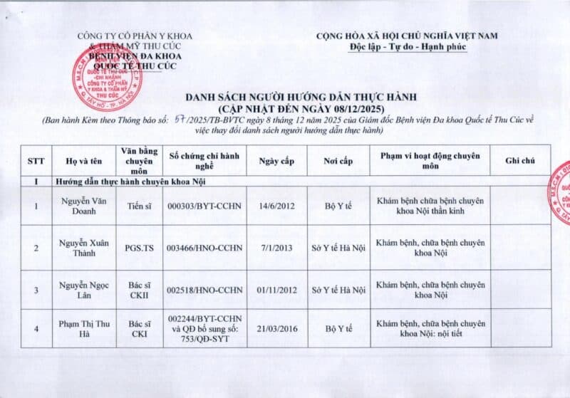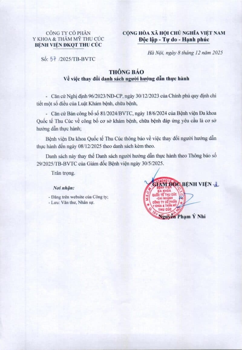 Bệnh viện Đa khoa Quốc tế Thu Cúc thông báo về việc thay đổi danh sách người hướng dẫn thực hành theo Thông báo số 57/2025/TB-BVTC của Giám đốc bệnh viện ngày 8/12/2025.