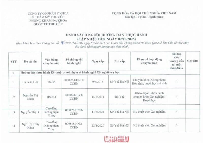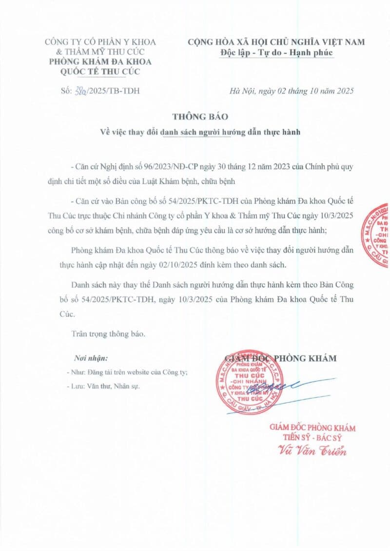 Phòng khám Đa khoa Quốc tế Thu Cúc thông báo về việc thay đổi danh sách người hướng dẫn thực hành theo Thông báo số 38A/2025/TB-TDH ngày 02/10/2025.