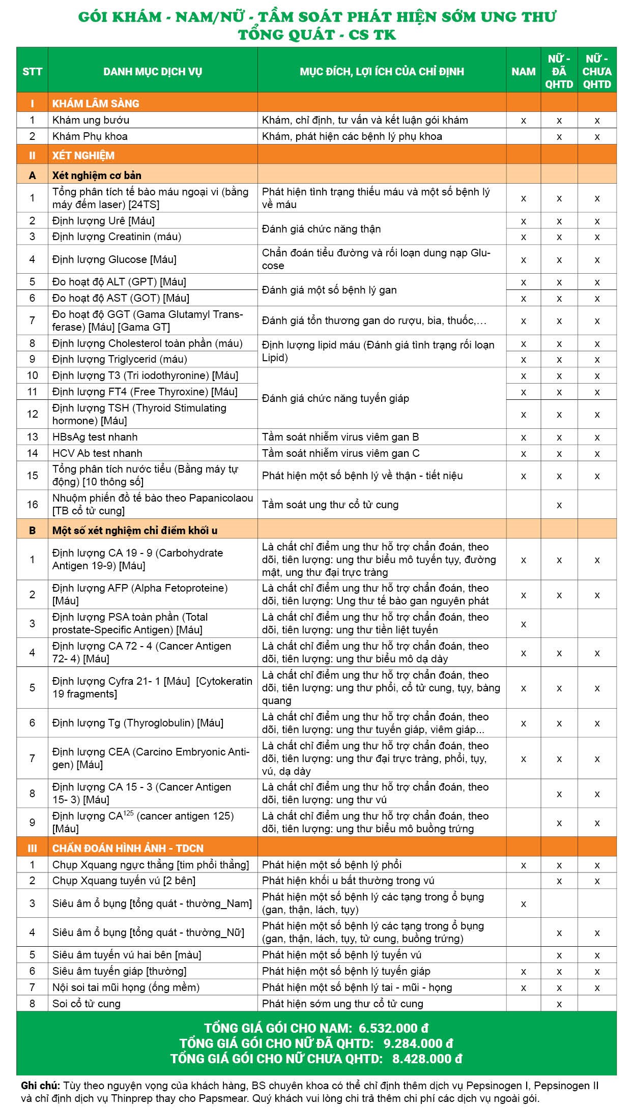 Tầm soát ung thư cổ tử cung, tầm soát nhiễm virus viêm gan B & C, đánh giá một số bệnh lý gan,...