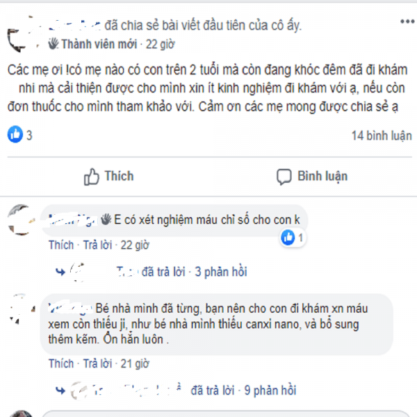 Chị Liên (32 tuổi – Cầu Giấy) đăng trong group (hội nhóm) các mẹ bỉm sữa chia sẻ: bé nhà chị được 2 tuổi hay khóc đêm, chị sốt ruột nên muốn hỏi các mẹ (mom) trong nhóm có kinh nghiệm trong việc này chỉ giúp, nếu còn đơn thuốc thì xin chia sẻ giúp chị. Rất nhiều mẹ đã vào bình luận (comment), chia sẻ “bí quyết” và đơn thuốc mà bác sĩ đã kê con họ hoặc tự mua ngoài hiệu thuốc mà áp dụng cho bé thấy đỡ. Vậy là sau đó mẹ liền “thí nghiệm” ngay cho con mình.
