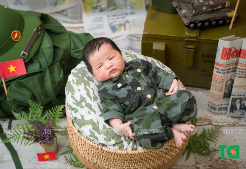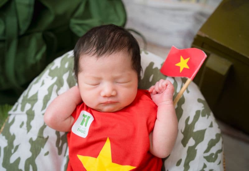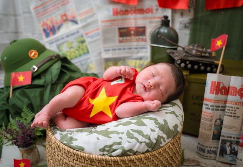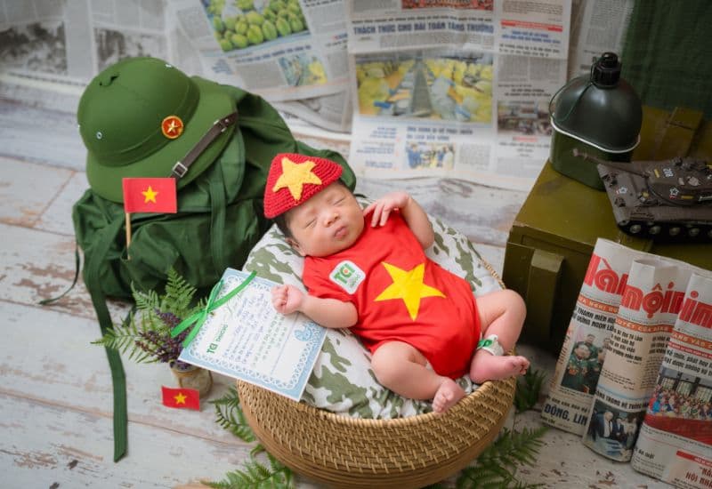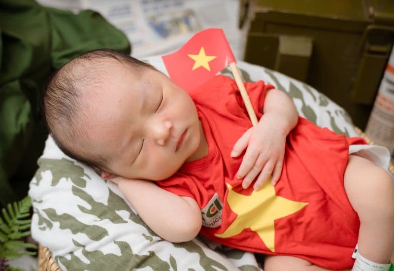 Hình ảnh các bé say giấc nồng trong khung cảnh hào hùng, thấm đẫm tinh thần yêu nước, được thực hiện bởi đội ngũ nhiếp ảnh gia chuyên nghiệp. Sau khi chụp, ảnh được chỉnh sửa tỉ mỉ, lưu giữ trọn vẹn khoảnh khắc đầu đời của bé trong không khí rộn ràng mừng một ngày thiêng liêng của toàn dân tộc.