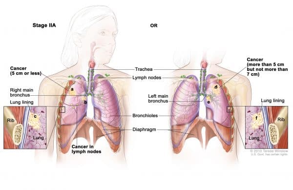 Lựa chọn phương pháp điều trị cho bệnh nhân ung thư phụ thuộc vào nhiều yếu tố. Đối với ung thư phổi không phải tế bào nhỏ, ung thư phổi giai đoạn 2 có đặc điểm ung thư đã phát triển rộng khắp các mô màng phổi, có kích thước đến 7 cm có thể gây bít tắc đường thở. Một hoặc nhiều khối u nhỏ riêng biệt có thể phát triển ở một bên phổi. Phẫu thuật, hóa trị, xạ trị là những phương pháp điều trị bệnh ung thư phổi phổ biến ở giai đoạn này.