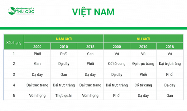 - Bảng xếp hạng ung thư tại Việt Nam từ năm 2000 đến 2018 (theo Trung tâm Thông tin Công nghệ sinh học Quốc gia Mỹ)