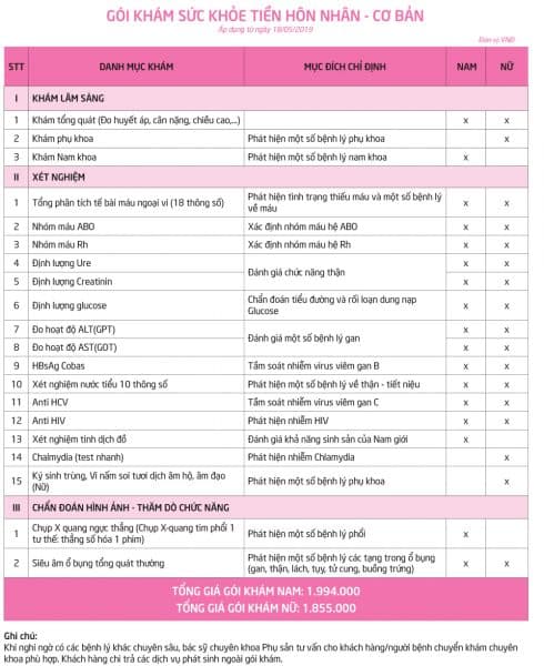 Danh mục gói khám tiền hôn nhân cụ thể như sau: