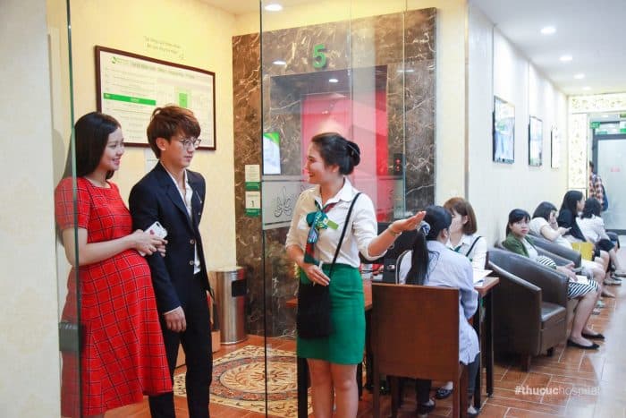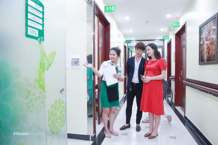 Được nhiều người quen giới thiệu, gia đình Á khôi Huyền Giang quyết định đến bệnh viện ĐKQT Thu Cúc để nghe tư vấn đăng ký gói sinh. Sau khi được tư vấn rất kỹ về dịch vụ Thai sản trọn gói, hai anh chị đã được tư vấn viên hướng dẫn tham quan tất cả các phòng mà Á khôi sẽ được trải nghiệm nếu sinh con tại đây.