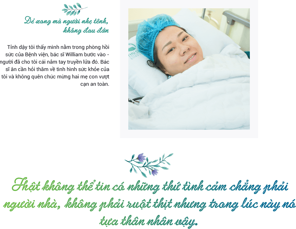 Bác sĩ hướng dẫn tôi nằm đúng tư thế, tiêm thuốc gây tê cho tôi. Tôi rất tỉnh táo và cảm nhận thật rõ từng thao tác của bác sĩ, đặc biệt là khi con yêu được lấy ra khỏi bụng. Nó giống như “giải phóng” một cái gì ra ngoài cơ thể. Nhưng cảm giác thân thuộc đã từng là da, là thịt không còn nữa.