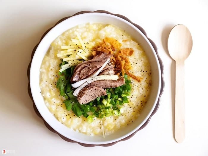 Bước 3: Múc cháo ra, rắc hành lá, rau ngò, tiêu, hành phi lên trên.