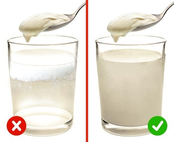 Khuấy một muỗng sữa chua vào cốc nước nóng. Sản phẩm kém chất lượng sẽ tạo ra lớp đông đặc trên bề mặt cốc, sữa chua nguyên chất sẽ hòa tan thành chất lỏng sánh đặc và đồng nhất.